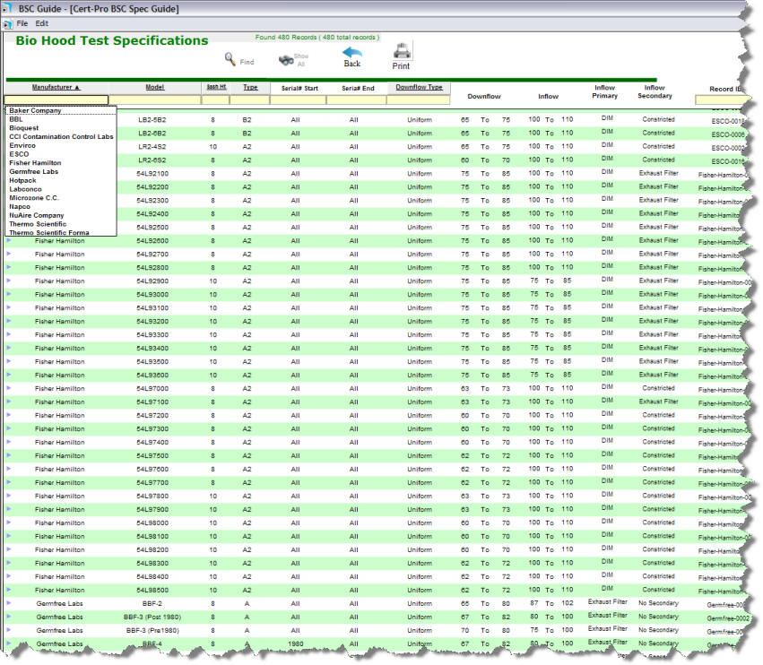 The Cert-Pro Spec Guide is an annual subscription service. After purchasing the initial guide, annual renewal charges will apply to maintain the spec guide. List View. Once you enter your search criteria, the spec guide will display a list of all hood meeting the criteria. This could be by hood manufacturer, model, hood class or even sash height. See the list view below: