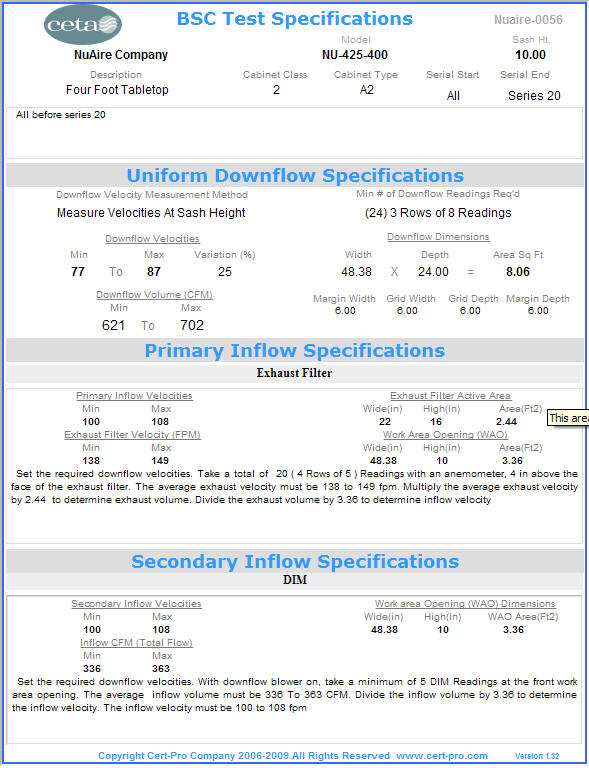 printing of all specifications required to certify most BSC's and Isolators. The spec